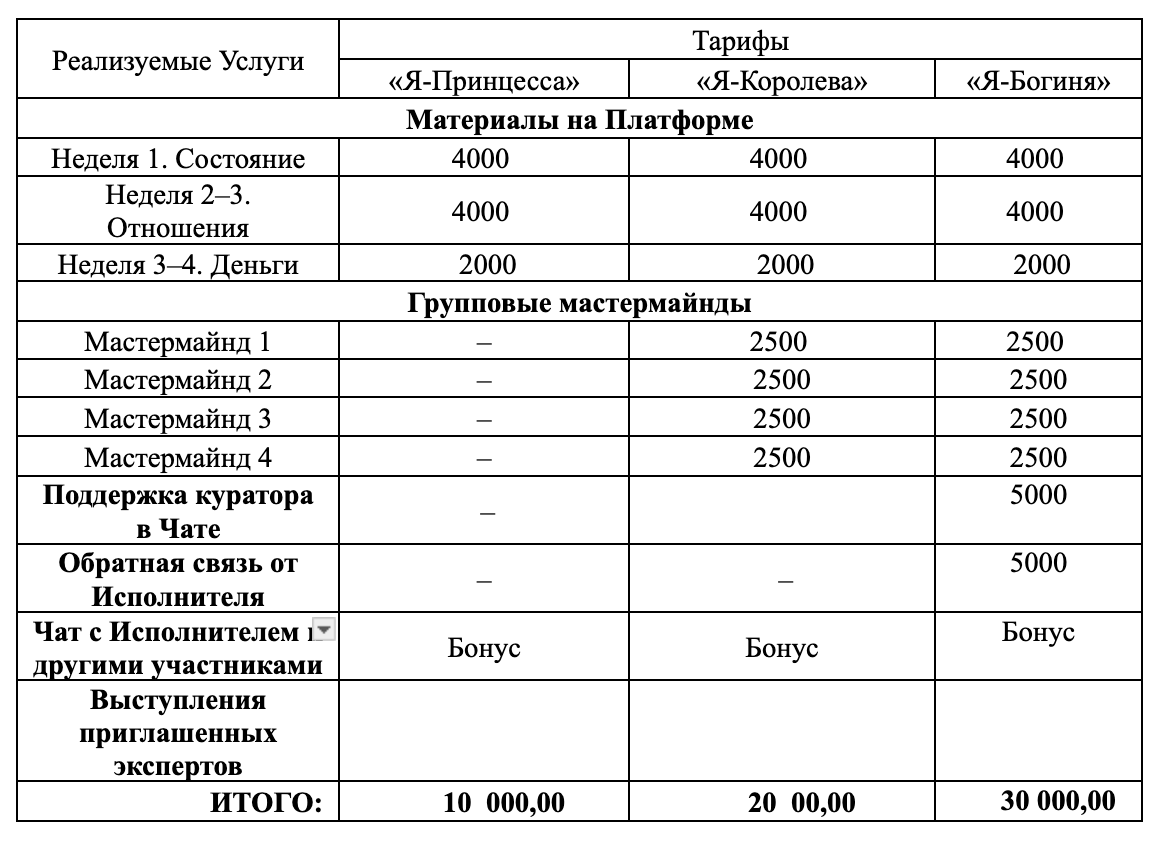 Я-БОГИНЯ» входят все материалы на Платформе и в Чате, минимум 3 групповые онлайн-конференции (мастермайнды), предоставление записей конференций,поддержка куратора в Чате, обратная связь от Исполнителя и финальная индивидуальная онлайн-встреча с Исполнителем.